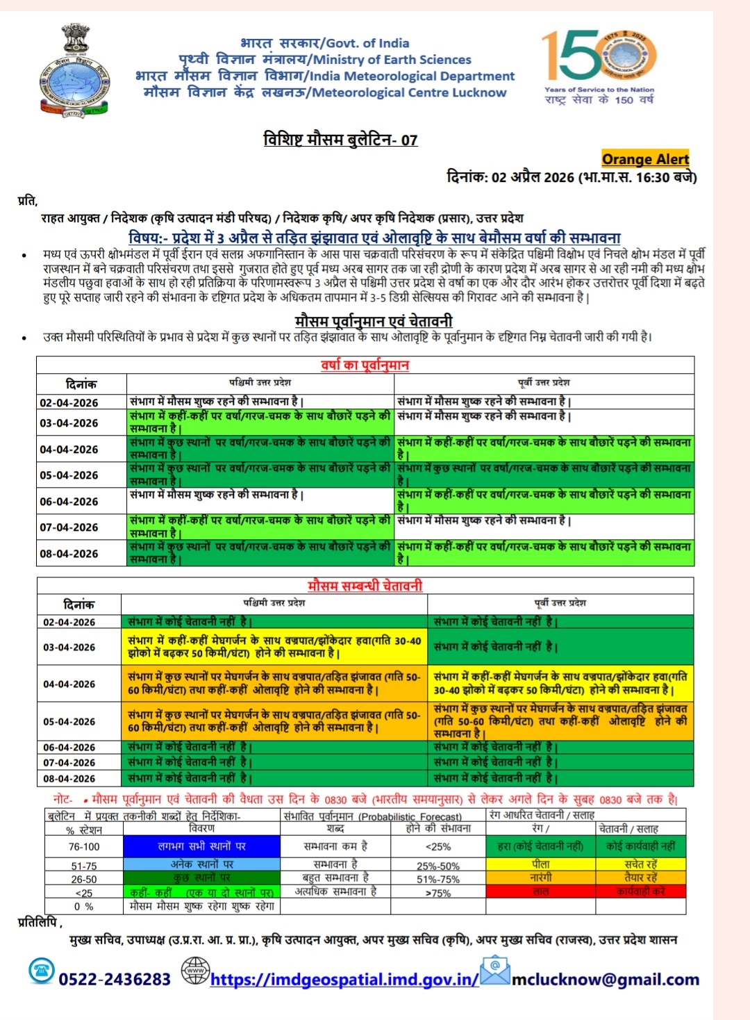 उत्तर प्रदेश में 3 से 6 अप्रैल तक आंधी, बारिश और ओलावृष्टि की चेतावनी
