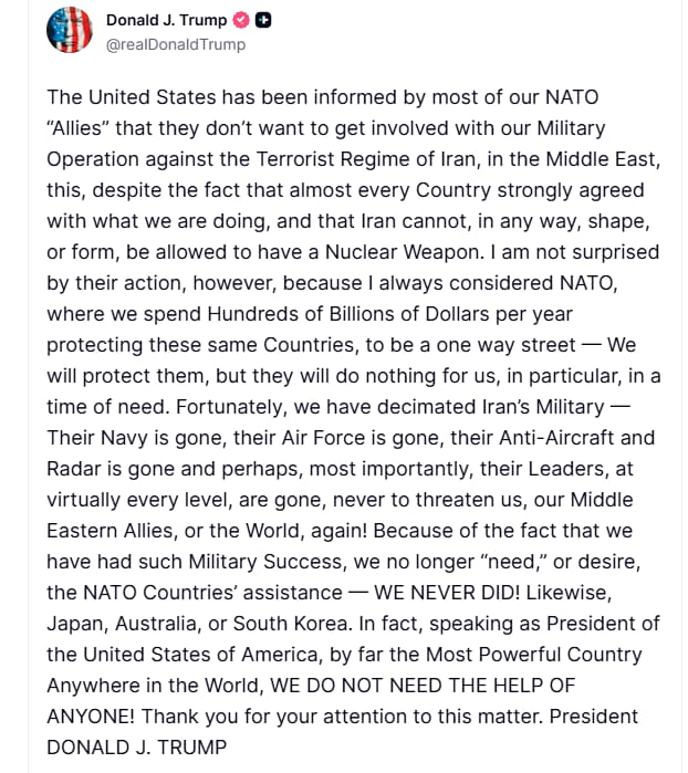 ट्रंप ने सोशल मीडिया प्लेटफॉर्म Truth Social पर पोस्ट करते हुए कहा कि NATO के अधिकांश सहयोगी देशों ने अमेरिका का साथ देने से मना कर दिया है। उन्होंने आरोप लगाया कि अमेरिका हर साल सैकड़ों अरब डॉलर खर्च कर NATO देशों की सुरक्षा सुनिश्चित करता है, लेकिन जब जरूरत पड़ती है तो वही देश पीछे हट जाते हैं।