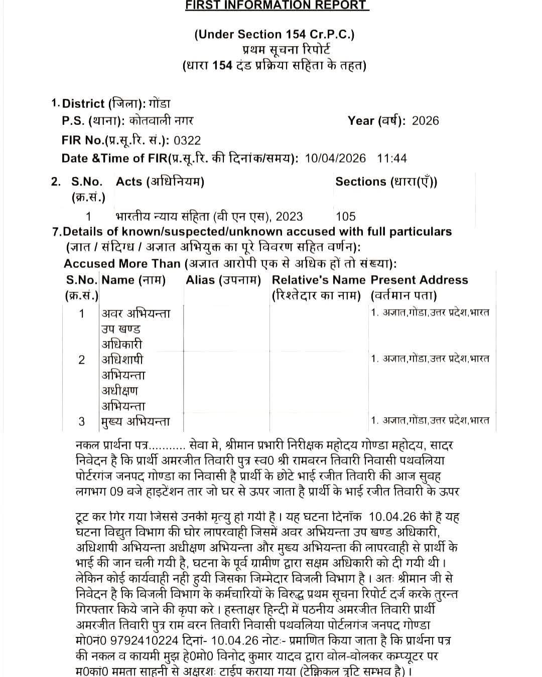 इस मामले में थाना कोतवाली नगर में एफआईआर संख्या 0322/2026 दर्ज की गई है। पुलिस ने भारतीय न्याय संहिता 2023 की धारा 105 (गैर इरादतन हत्या) के तहत बिजली विभाग के जेई, एसडीओ, एक्सईएन, एसई और चीफ इंजीनियर को नामजद किया है।